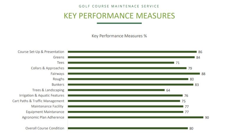 We track 13 key performance indicators to drive steady, tangible gains across course conditions, staff productivity, resource usage, fleet management, and operational efficiency.